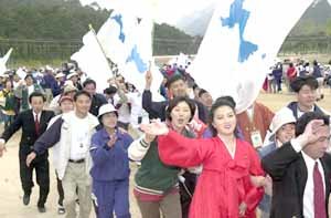 メーデーの1日午前、北朝鮮の金剛山(クムガンサン)オンジョン里にある金正淑休養所運動場で開かれた「南北労働者メーデー統一大会」で、韓国労総、民主労総の組合員らと北朝鮮側、朝鮮職業総同盟の労働者ら1000余人が一団になって交わり、輪を作って運動場を回っている。