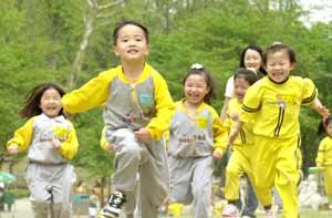 子供の日を一日控えた4日、ソウル市広津(クァンジン)区にある「オリニ(子供)遊園地」を訪れた幼稚園生たちが先生たちとともに青い芝生の上を走り周りながら楽しんでいる。