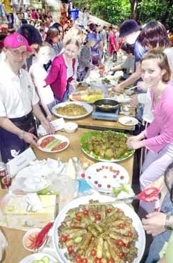 16日、慶熙(キョンヒ)大国際教育院前の小運動場で開かれた「2001外国人ハンマダン行事」で、参加者たちが直接作った各国の民族料理を紹介している。慶熙大側は、国内の大学に通っている外国人学生たちの和合を図るために設けた行事だと説明した。