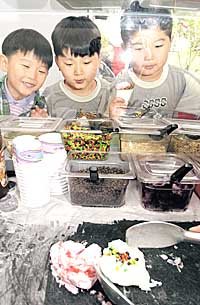 고객의 취향에 따라 갖가지 재료를 냉동 대리석 위에서 비벼 만들어주는 콜드락 아이스크림. 콜드락 원효점을 찾은 호기심많은 꼬마 손님들이 요리가 끝나기를 기다리고 있다.