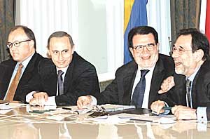 ロシアを訪問した欧州連合(EU)首脳代表団とプーチン大統領が17日、モスクワ・クレムリン宮での会談途中、楽しそうに笑っている。左からEU議長国、スウェーデンのペーション首相、プーチン大統領、EU執行委員長、EU外交安保委員長。