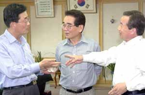 忠清南道天安市(チュンチョンナムド・チョンアンシ)にある情報通信部公務員教育院で、19日と20日の両日間にわたって行われた与野党と政府による経済政策フォーラムに出席した陳稔(ジン・ニョム)副首相兼財政経済部長官(真ん中)が、休憩時間に与党民主党の姜雲太(ガン・ウンテ、右)、野党ハンナラ党の李漢九(イ・ハング)議員らと話し合っている。