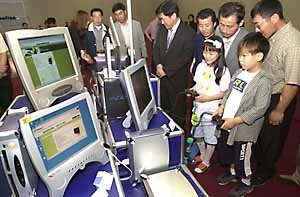 23일 부산 전시컨벤션센터 개관기념으로 열린 부산디지털전자전에서 어린이들이 새로 나온 오락기를 시연해보고 있다.