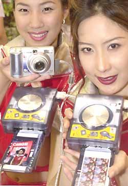 ソウル市江南区(カンナムク)三成洞(サムソンドン)にあるCOEXで27日まで開催される「2001ソウル国際写真映像機械・資材展」で、イベント・ナレーターたちが、その場で印刷できるデジタルカメラとプリンターを紹介している。
