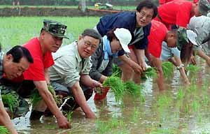久しぶりに雨が降った13日、与党民主党の金重権(キム・チュングォン)代表は京畿道華城市(ギョンギド・ファソンシ)で(上)、野党ハンナラ党の李会昌(イ・フェチャン)総裁は京畿道広州市(ギョンギド・グァンジュシ)の田植えを手伝った(中)。自民連の金鍾弼(キム・ジョンピル)名誉総裁は京畿道麗州郡(ギョンギドヨジュグン)で干ばつの被害に対する報告を聞いている。