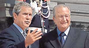 유럽 순방길에 나선 조지 W 부시 미국 대통령(왼쪽)이 13일 두번째 방문국인 벨기에의 라에켄궁 앞에서 알베르 2세 국왕과 담소를 나누고 있다.