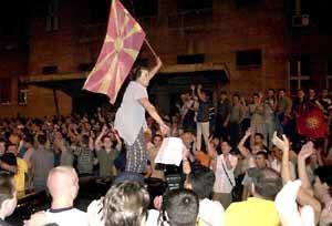 25日午後、マケドニア首都スコピエの国会議事堂前でアルバニア系反軍との休戦に抗議して、デモ隊に参加した女性が車の上で国旗を振りながら、デモ隊を煽り立てている。