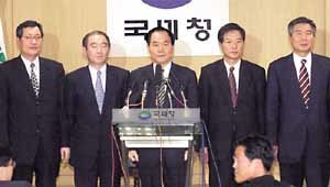 マスコミ各社の税務調査を実施したソウル地方国税庁幹部らが結果発表に先立ち、緊張した表情で立っている。右側からキム・ジョンボク調査3局長、チョン・ジンテク調査1局長、孫永来(ソン・ヨンレ)庁長、イ・ジュソン調査2局長、ユ・ハクグン調査4局長。