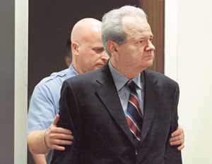 人道に対する罪などの容疑で起訴されたユーゴのミロシェビッチ前大統領が3日、初公判に出廷するためオランダ・ハーグの国際戦犯法廷に向かっている。