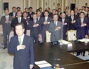 3日、大統領府の青瓦台(チョンワデ)で「クリーンな政府に向けた腐敗防止対策の報告会議」が開催された。会議前、金大中(キム・デジュン)大統領や出席者らが国民儀礼を行っている。