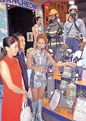 ソウル江南区三成洞(ガンナムグ・サンソンドン)のコエックス(韓国総合貿易展示場)で開かれている国際安全機器展示会に参加したメーカーの案内係りの女性が観客に呼吸器、防火服などについて説明している。