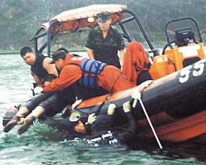 へリコプター墜落事故の直後に出動した海軍の海難救助隊(SSU)隊員と海洋警察の救助隊員が、海の底から死体を引き揚げている。