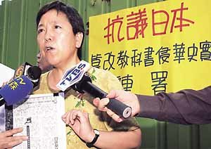 台湾の右派性向の強い「新党」の女性党首が7日、台北駅で第2次世界大戦当時、日本軍の蛮行を歪曲する歴史教科書を日本政府が認定したのに対し、抗議デモを行っている。党首は日本の歴史教科書問題には、中国と台湾が協調して対応すべきだと主張した。