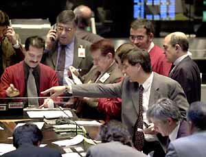 16日、アルゼンチン・ブエノスアイレスの証券取引所で、仲介人たちが注文を出している。この日、メルバル指数は政府の緊縮財政政策に対する野党の反対で、先週に比べて1.6%ポイント下がった323.96で引け、暴落事態は避けられた。