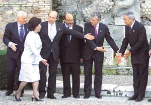 田中真紀子外相が18日、イタリアのローマで開かれた主要国外相会議に出席した各国の外相らとともに記念撮影を撮る前に、パウエル(右)米国務長官ら出席者の案内を受けている。