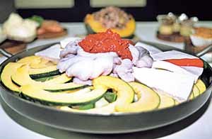 かぼちゃご飯は、かぼちゃのへたの部分を丸く切取り、種を取り除いた後肉から取ったスープを入れ、もち米、うるち米、粟、黍、黒米、栗、なつめ、銀杏を詰めて蒸したもの。サツマイモや栗のように甘みのあるかぼちゃに、香ばしい穀物の味がうまく染み出ているうえ、お惣菜として添えている4種類の野菜の和え物や、かぼちゃの葉などとうまくマッチしている。マダコとかぼちゃ、そして焼き肉(ブルコギ)が一つになったブルナックかぼちゃなべ(チョンゴル、7000ウォン)は、かぼちゃのうまみがうまく染み出ているせいか、香ばしくてさっぱりした後味がする。