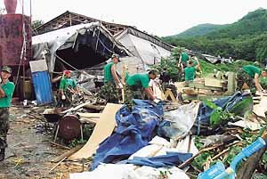 1日、突風によって住宅数十軒が破った京畿道坡州市(ギョンギド・パジュシ)グァンタンミョンで軍人らが復旧作業を行っている。