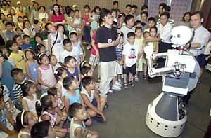 「どう、カッコ良いでしょう」。2日、ソウル江南区(カンナムク)駅三洞(ヨクサムドン)韓国科学技術会館で開かれた東亜サイエンス社主催の「ロボット・フェスティバル」に参加した子供らが、韓国科学技術院(KAIST)が出品したヒューマン・ロボット「アミ」の技に見入っている。