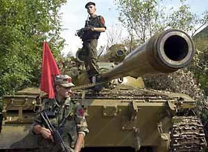マケドニアのアルバニア系武装組織が23日、首都のスコピエ北部地域のラドゥサ町で、政府軍から奪取したロシア製タンクを守っている。反軍の武装解除の作業を主導する北大西洋条約機構(NATO)軍兵力らが次々へとマケドニアに到着している中、24日、北部地域のラタエ、ジルチェ地域などで政府軍と反軍間との交戦が展開された。
