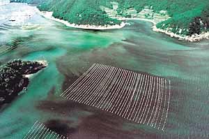 ナムド・トンヨンシ)沖の養殖場を襲った赤潮の帯が、まるで油の帯のように鮮明に写っている。
