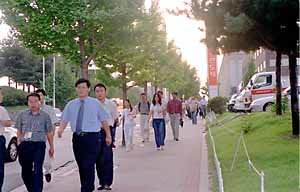 午後6時ごろに帰宅するハイニクス社の利川(イチョン)工場の職員ら。31日の債権銀行団の頭取会議を控えて、会社の運命が危機に直面していることもあってか、表情が明るくない。