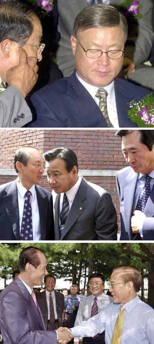 林東源(イム・ドンウォン)統一部長官の解任建議案をめぐる票決を一日後に控えた2日、ソウル将忠(チャンチュン)体育館で開かれた「青少年フェスティバル」の途中、イ・ホオン代表秘書室長から報告を受けている与党民主党の金重権(キム・ジュングォン)代表(左)、そして自民連の金鍾泌(キム・ジョンピル)名誉総裁の自宅訪問を終えた党員ら(中)の深刻かつ緊迫な表情とは異なり、国会運動場で開かれた韓国写真記者協会の体育大会で李萬燮(イ・マンソプ)国会議長と握手を交わしている野党ハンナラ党の李会昌(イ・フェチャン)総裁の表情は明るい。
