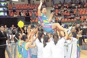 新世界は9日、ソウル蚕室(チャムシル)体育館で開かれた現代ハイペリオンとの2001女子プロバレーボールの夏季リーグチャンピオン決定5回戦で68—65で逆転勝ちし、大会2連覇とともに、チーム結成以来、三番目の優勝を果たした。優勝賞金は3000万ウォン。