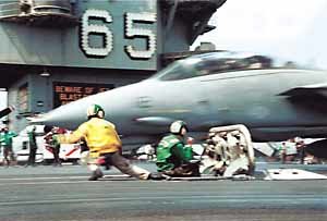 同時多発テロに対する米国の報復軍事作戦が差し迫ったなか、12日、アラビア海上の空母エンタープライズ号で整備兵らが艦載機の出動態勢を点検している。