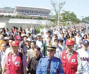 23日、仁川市庁を出発し、仁川W杯競技場を往復する10km区間で開かれた2002W杯の成功を祈願する韓日開催都市巡回歩け歩け第17次仁川大会は、晴れ上がった初秋の空の下で2000名余りが参加したなかで行われた。