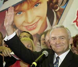 23日、実施したポーランド総選挙で左翼連合の勝利を主導した民主左翼連合(SLD)のレシェク・ミレル党首が歓呼する支持者らに手を振って応えている。今回の総選挙で左翼連合が勝利したことから、これまでの4年間継続した左右同居形の政府のあり方が一変することとなった。
