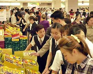 추석연휴를 하루 앞두고 백화점 등에는 추석선물을 사려는 사람들로 붐비고 있다. 28일 서울 중구 소공동 롯데백화점 본점에서 판매사원들이 손님들에게 상품에 대한 설명을 하고 있다.
