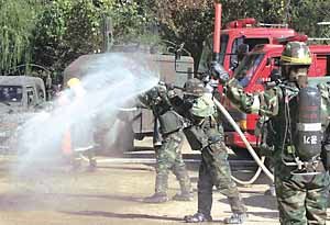 炭疽菌テロの恐れが全世界に広がれているなか、17日、ソウル瑞草区(ソチョグ)のCBR防護司令部の練兵場で、兵士らが「CBRテロに備える訓練」を行っている。兵士らが毒ガスが撒布された状況を想定し感染された場所を水で洗浄している。