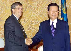 金大中(キム・デジュン)大統領は17日、大統領府で、第2回の世界知識フォーラムに出席するため訪韓した米国のマイクロソフト社のビル・ゲイツ会長と話し合った。