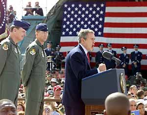 ブッシュ米大統領は16日、アジア太平洋経済協力会議(APEC)首脳会議に出席するため上海に向かう途中、経由地のカリフォルニア州トラビス空軍基地で、断固たる意思表示として握りこぶしのまま、対テロ戦について演説している。