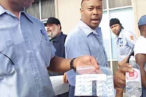 米国ワシントンの郵便局職員らが23日、当局の指示に従って市内の総合病院で義務的に炭疽菌の感染検査を受けた後、炭疽菌抗生剤のシフロ剤を配給されている。