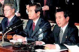 沈載権(シム・ジェクォン)民主党総裁室長(右側)が8日開かれた党務会議で金大中大統領の総裁職辞退発表文を読み上げている。