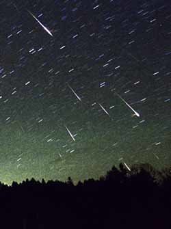 日本北海道で19日未明撮影した獅子座の流星群、左方の上から右方の下に長い尾を引いた線らが流星群であり、空一杯になった短い棒はカメラの露出時間の間星らが動いたこん跡だ。露出時間は3分。