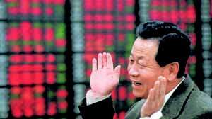 26日、総合株価指数が30ポイント近く上昇した674.56を記録し、株式の相場を知らせる電光掲示板に軒並赤いランプが点くと、一人の投資家が拍手をしながら喜んでいる。