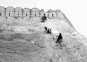 25日、イスラム原理主義勢力タリバーンの拠点であるアフガニスタン北部地域のクンドゥーズで降伏した外国人支援兵の捕虜が暴動を起こした直後、捕虜か、北部同盟の警備兵か定かでない兵士らが収容所を脱出し、急いで要塞の壁をつたって降りてくるシーンをドイツのテレビ放送局のカメラがとらえた。