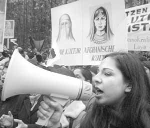 アフガニスタン政派会議が開催されているドイツのボーンで27日、市民らがピケットを持ってアフガンの女性に自由と平等を求めるデモを行っている。