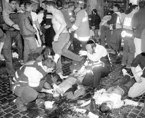 イスラエルの医療陣が1日、エルサレムの自爆テロの負傷者に応急措置をしている。