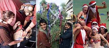アラビア海で作戦中の米軍艦上で、2人の女性兵士が24日、米国の故郷の家族から郵送されてきたクリスマスプレゼントを開いて喜んでいる(右)。同日、アフガニスタン・カブールで、現地人らが、戦争前後から大挙増えた外国人に売るクリスマスツリーを運んでいる(中)。サンタの衣装をまとったヨーロッパの旅行者らが25日、真夏の蒸し暑さが続くオーストラリア・シドニーの海辺で水しぶきをあげクリスマスを楽しんでいる。