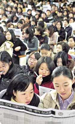 4日、ソウル鐘路区(チョンノグ)にある培花(べファ)女子大学で、中央予備校が主催した専門大学(日本の短期大学に当たる)の入試説明会に参加した受験生や父母たちが入試専門家の説明を聞き、受験する大学について相談している。