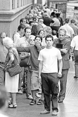 4日、アルゼンチン・ブエノスアイレスの銀行の前に並んだ市民。市民らは新政権のペソ切り下げ措置に先立ち、預金を引き出すために先を争って銀行を訪れている。