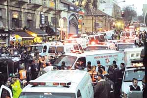 22日、イスラエルのエルサレム中心街のジャファ通りでパレスチナ人の男が自動小銃を乱射した直後、10台以上の救急車が負傷者を運んでいる。 この銃撃で2人が死亡し、40人以上が負傷した。