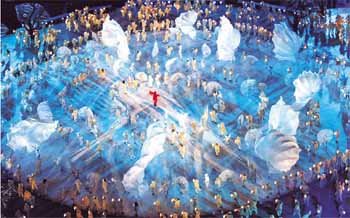 2002年ソルトレークシティー冬季五輪を輝かす聖火がいよいよ燃え上がった。9日、ライス・エクルズオリンピックスタジアムで、77カ国から2300人余りの選手が参加して行われた開幕式。「内なる炎を灯もせ」というテーマで、約2時間40分間にわたって行われた開幕式は、それこそ雪と氷が絶妙に調和を成した「アイスショー」だった。