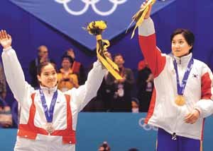 ショートトラック女子1500で金と銀メダルを獲得した、 高基玄(コ・ギヒョン、右)選手と崔ウンギョン選手が表彰式場で観客の歓声に手を振ってこたえている。