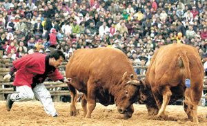 慶尚北道清道郡(キョンサンブクド・チョンドグン)イソ面のソウォン川辺で10日、10万人の観光客が見守る中「2002清道闘牛フェスティバル」が開かれた。このフェスティバルには、全国から135頭の闘牛が出場して強さを争う。フェスティバルは17日まで開かれる。