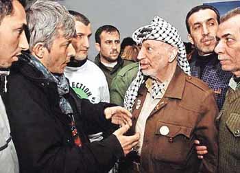 先月31日、イスラエル軍の包囲網を突破してパレスチナ自治政府のアラファト議長の庁舎に入った西側の反戦運動家らが2日、軟禁中のアラファト議長と話を交わしている。