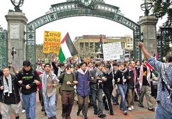 パレスチナ寄りの学生らが9日、米バークリー大学の校門前でイスラエルを批判するプラカードを手にデモを行っている。同じ時間、キャンパス内ではユダヤ系学生らがナチス政権下で行われたユダヤ人大虐殺を追悼する追悼式を行った。